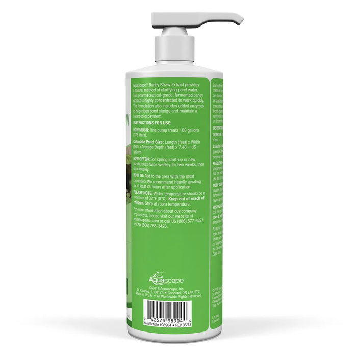 Aquascape Barley Straw Extract for ponds provides a natural method of clarifying pond water. Barley straw has been used for hundreds of years to promote clean and clear water conditions in ponds and streams. Now, you too can take advantage of this natural method without the hassle of dealing with barley straw bales, a typically messy process. Aquascape Barley Straw Extract starts working instantly and the concentrated formulation contains added enzymes to help break down sludge and clean filter pads, significantly reducing maintenance. Our Barley Straw Extract is safe for fish, plants, pets, and wildlife.